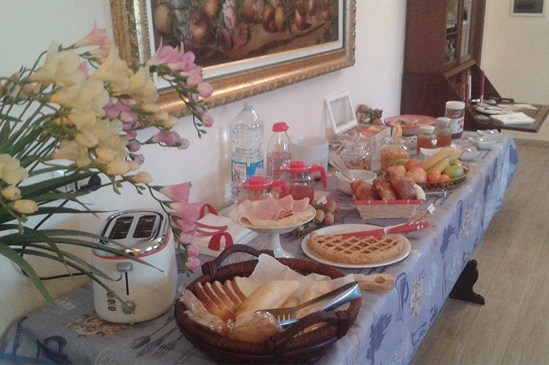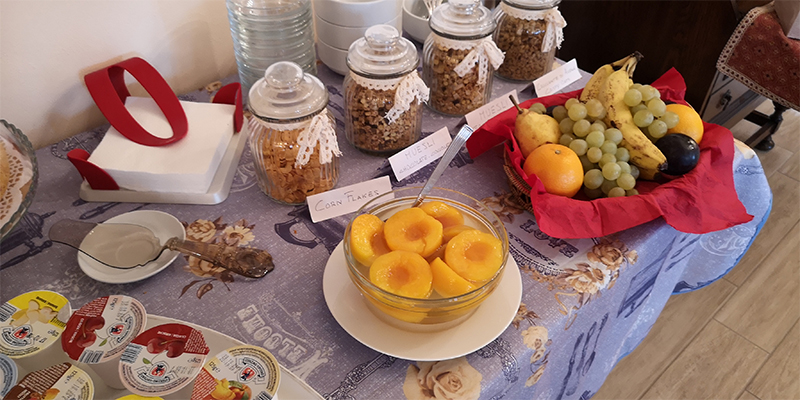 Al buffet troverete brioches di pasticceria, pane fresco e da tostare, fette biscottate, burro e marmellate, crema di cioccolato,miele, yogurt, cereali e muesli, succhi di frutta o spremute, frutta di stagione e sciroppata e … naturalmente le torte fatte in casa: crostate, ciambelle, cheesecake…